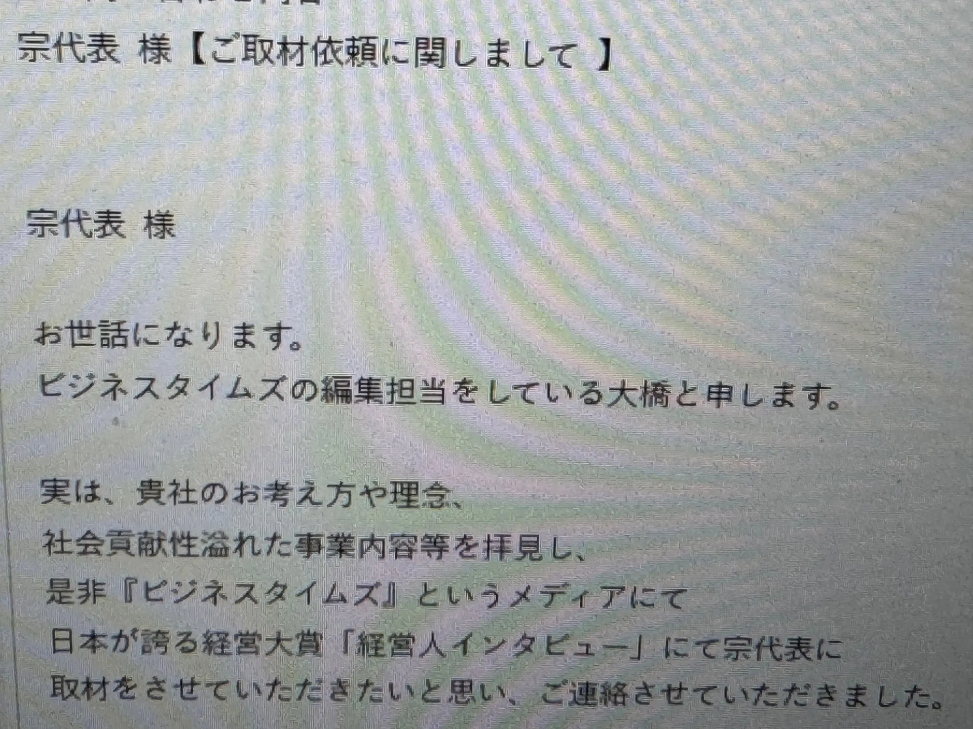 日本が誇る経営大賞「経営人インタビュー」にて代表に取材をさせていただきたいと思い、ご連絡させていただきました。
